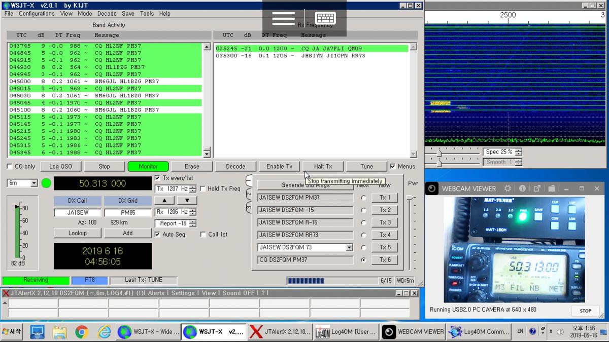 원격 접속을 통한 환경에서 WSJT-X 라는 프로그램을 이용해 FT-8 교신을 하는 모습. 우측 하단에는 USB 카메라를 추가했습니다. 무전기의 주파수와 전파 송신시 적당한 상태인지 파악할 수 있습니다.
