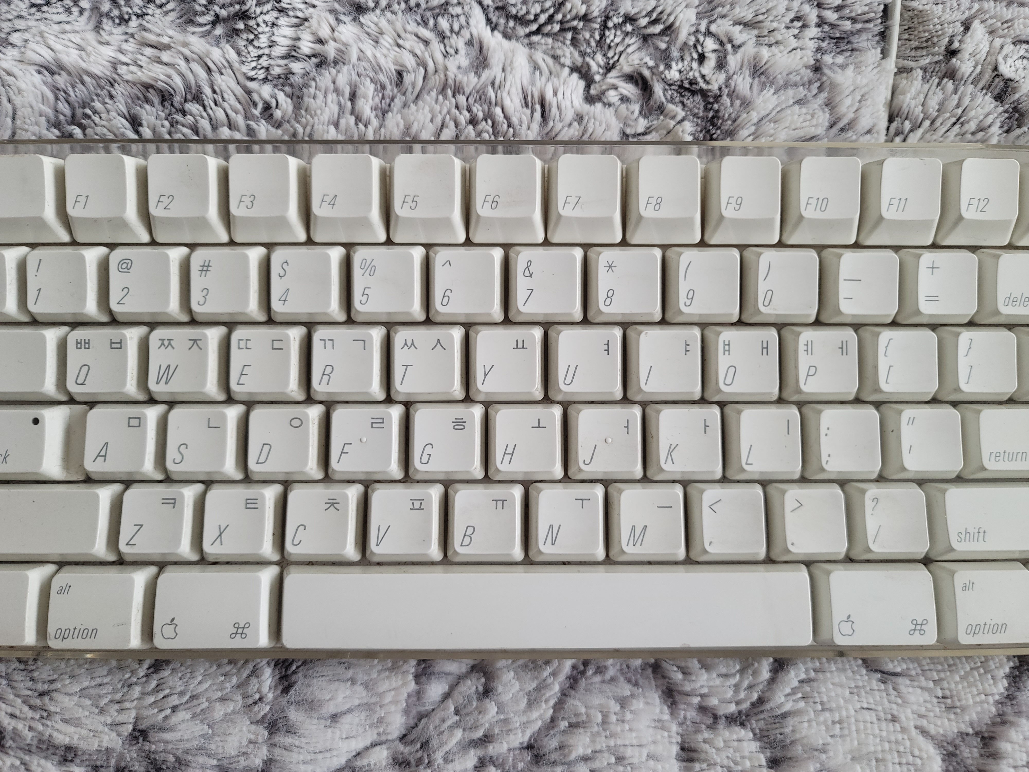 1. 키보드에 인쇄된 글씨가 Mac 계열은 영문이 좌측하단, 한글이 우측상단 입니다. Windows 계열은 영문은 좌측상단, 한글은 우측하단 입니다. 그래서 이런거 거슬리는 분은 그냥 영문키보드로 주문하곤 하죠.