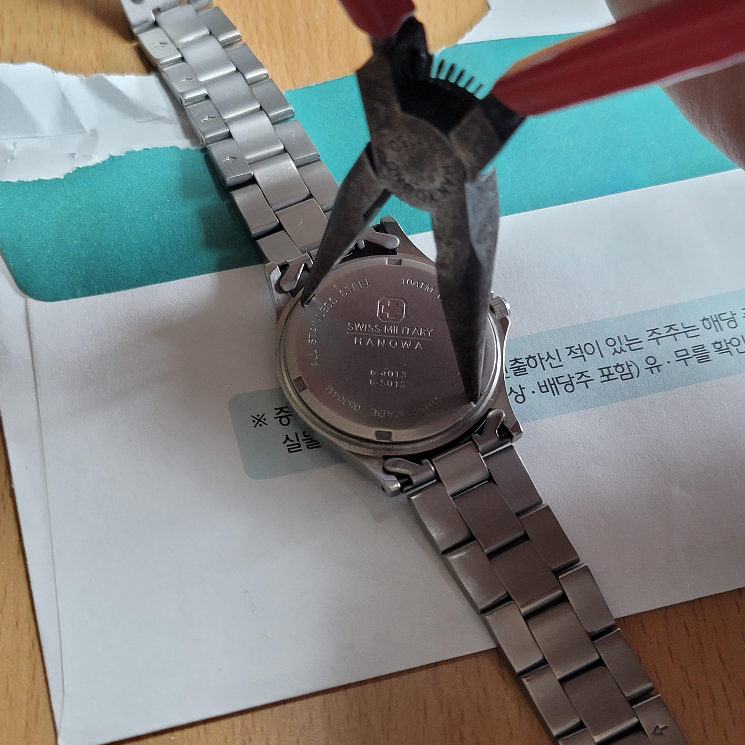 시계 뒷판을 열 준비를 합니다. 전용 공구가 없기 때문에 그냥 롱노우즈로 딱 맞춰서 꼽아서 돌리면 잘 돌아갑니다. 삐끗해서 기스가 좀 나긴 했는데 어차피 편하게 차는 시계이므로 그정도는 괜찮습니다.