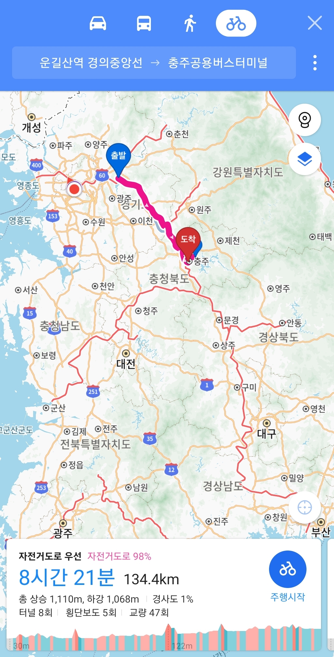 출발은 운길산역의 밝은광장(지난번 세이브 지점)에서 시작하였습니다. 1일차 마무리는 75km 정도 거리의 '강원도 원주시 부론면' 입니다. 다행히 해가 지기전에 도착했네요.