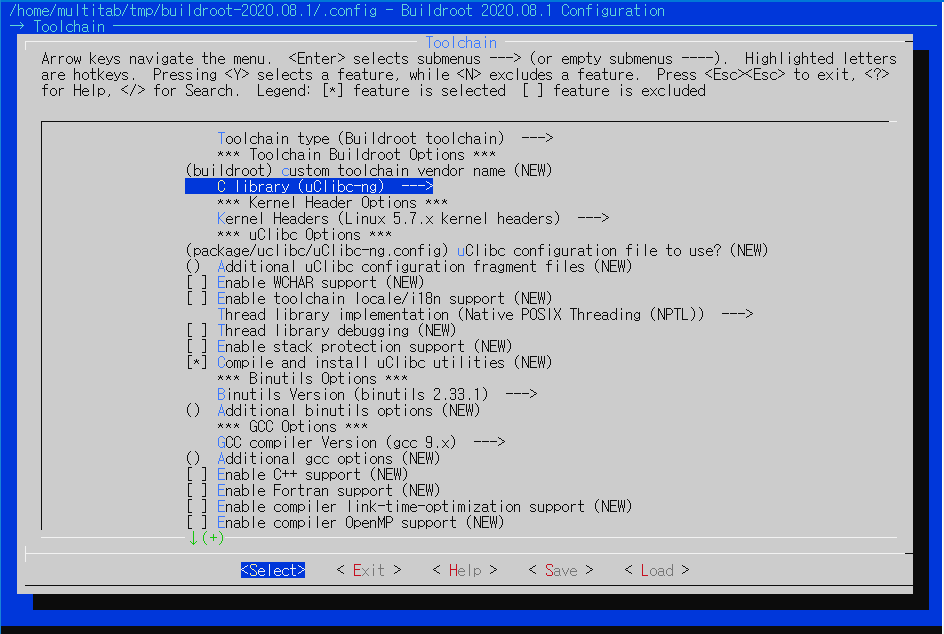이전 버전들은 원래 glibc 가 아니고 경량버전인 uClibc-ng 가 선택되어 있네요. 위에서 선택한 값 외에 추가로 Toolchain 메뉴에서 glibc 로 변경해 줍니다.