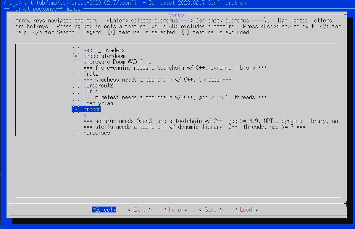 Buildroot 의 항목중 Target 부분에 Games 항목이 있습니다. 여기에서 prboom 을 체크해 주면 buildroot 구성시 prboom 도 함께 컴파일해 줍니다. 위에는 chocolate-doom 도 있네요.