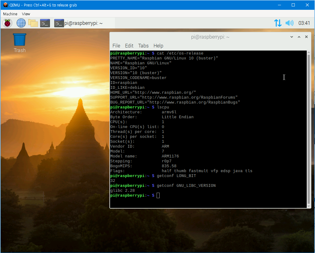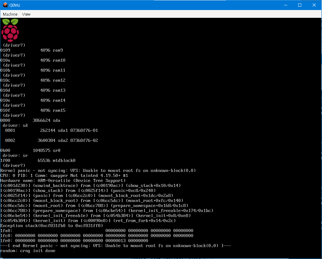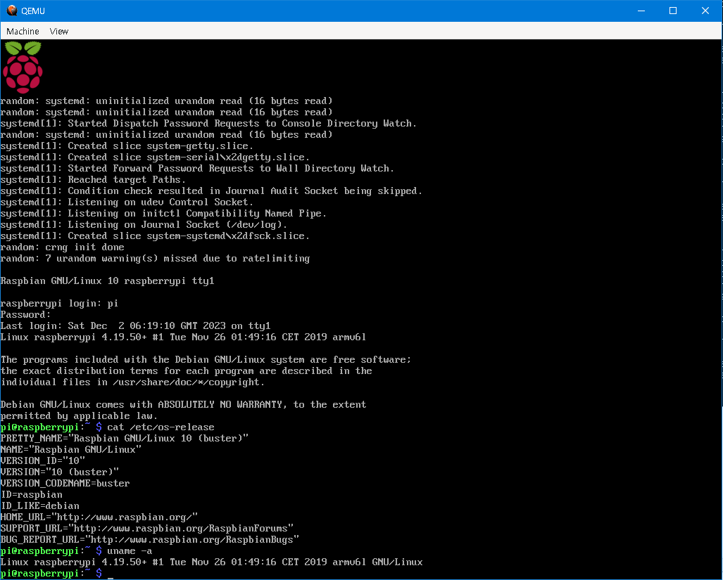 C:\Users\multitab\Downloads>"C:\Program Files\qemu\qemu-system-arm.exe" -M versatilepb -cpu arm1176 -m 256 -hda 2023-05-03-raspios-buster-armhf.img -net nic -net user,hostfwd=tcp::5022-:22 -dtb versatile-pb-buster.dtb -kernel kernel-qemu-4.19.50-buster -append 'root=/dev/sda2 panic=1' -no-reboot