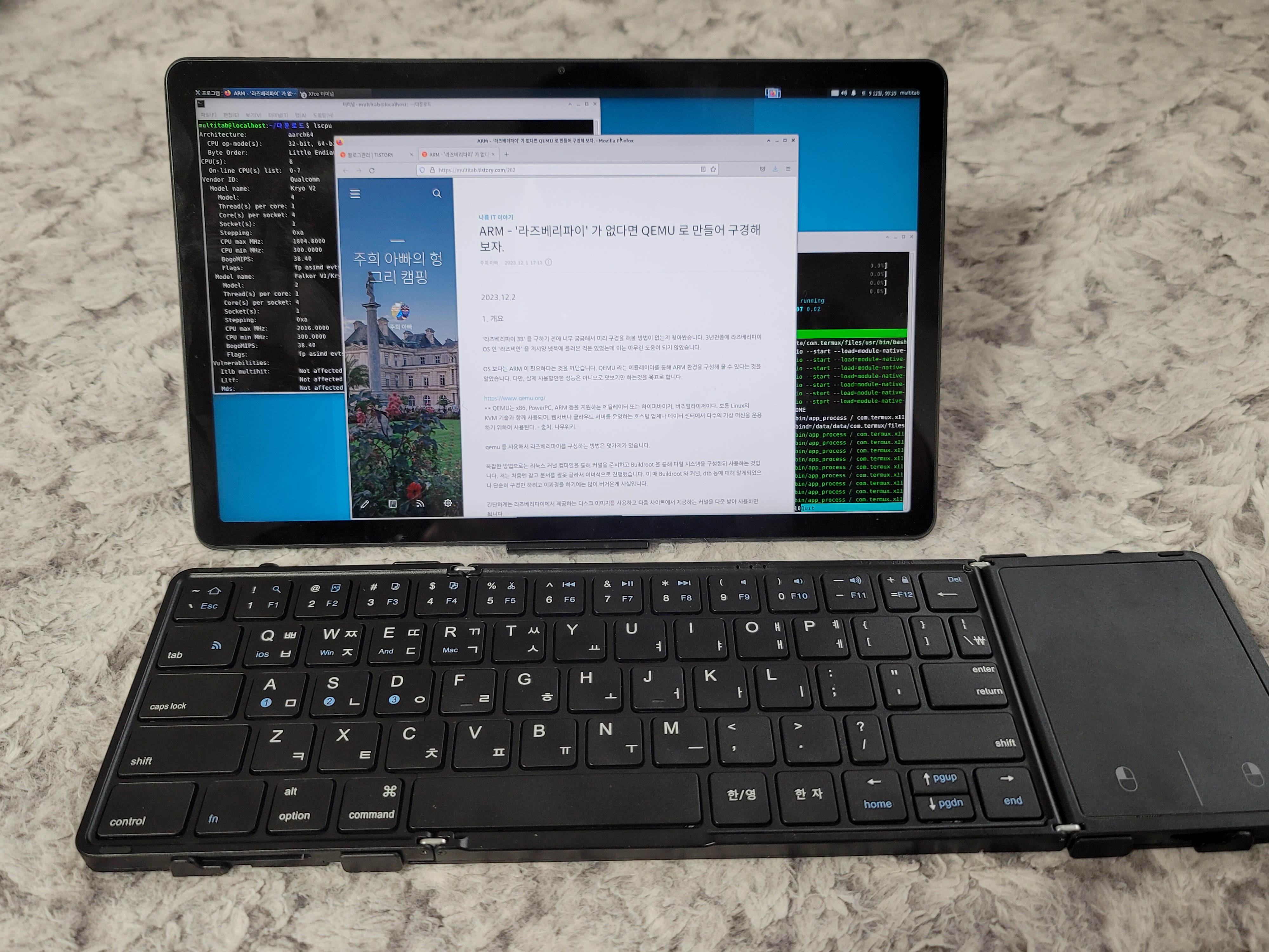 태블릿의 경우 원래 함께 판매되는 정품 키보드세트가 있으면 예쁘고 좋겠습니다만 일반 블루투스 키보드와 마우스로 연결해도 괜찮습니다. 지금 이글의 일부도 태블릿에 설치된 리눅스 환경에서 수정 작업중입니다.