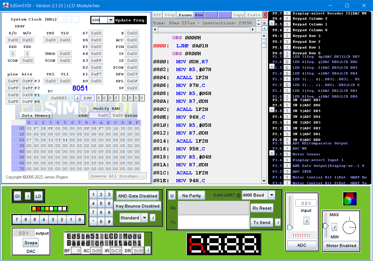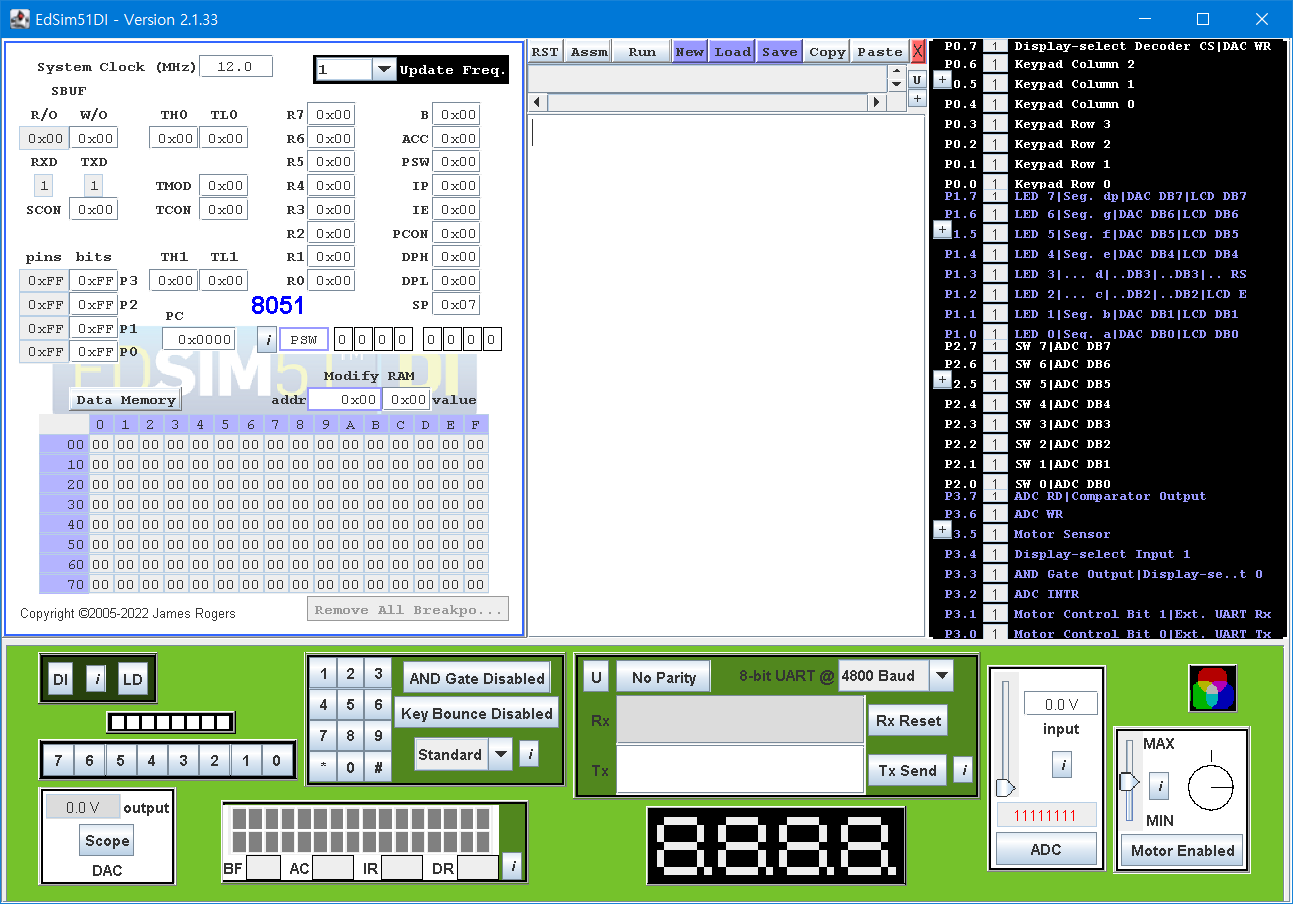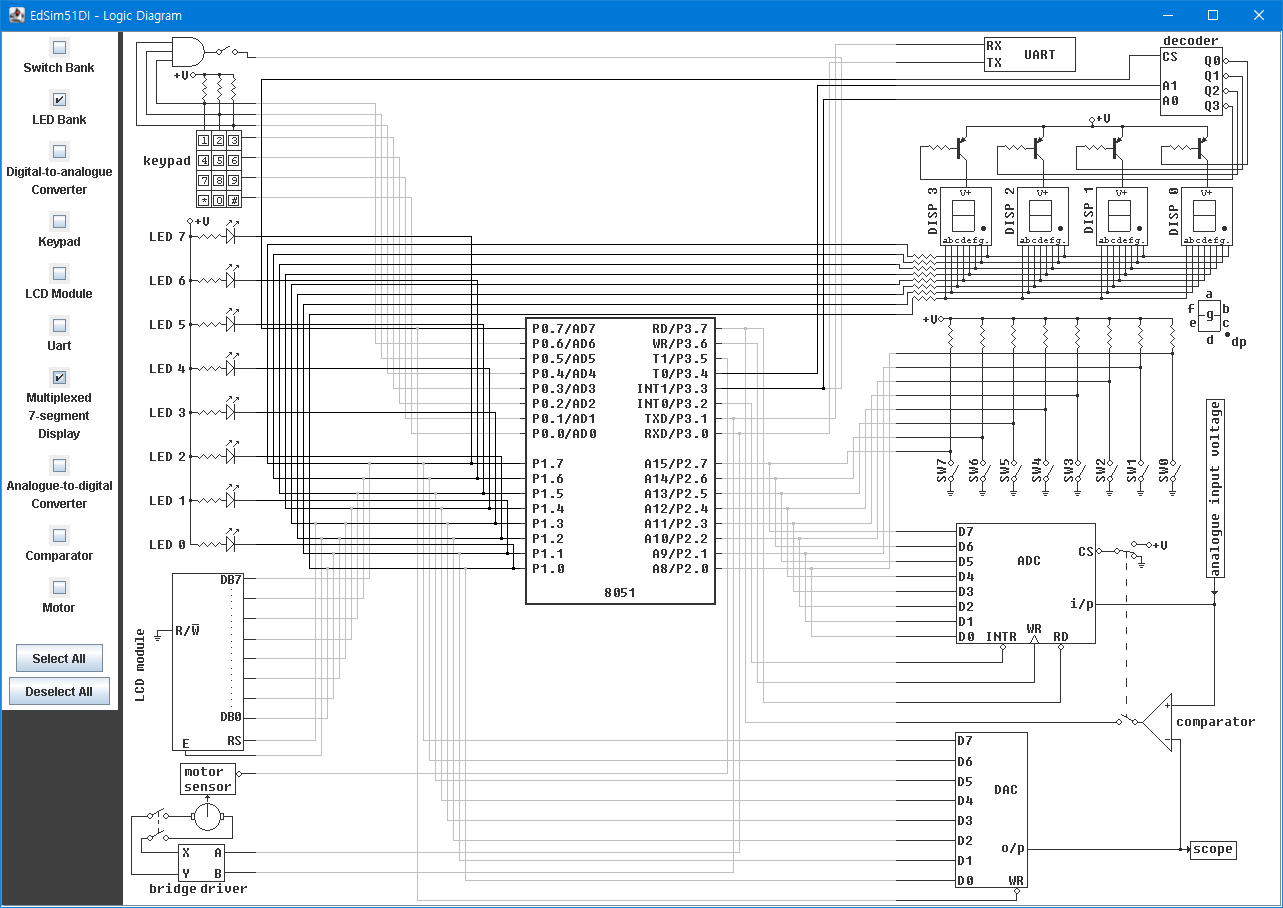 EDSIM51은 James Rogers 라는 분이 학습용으로 만든 8051 시뮬레이터로 몇 가지 외부 장치들을 내장한 것으로 구현되어 있습니다. 마치 요즘 나오는 '아두이노 교육용 키트' 와 같은 종합 선물 세트입니다.