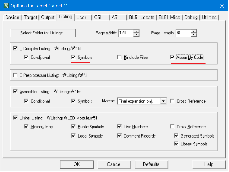 Listing 에서 Symbols 과 Assembly Code 에 체크해 줍니다.