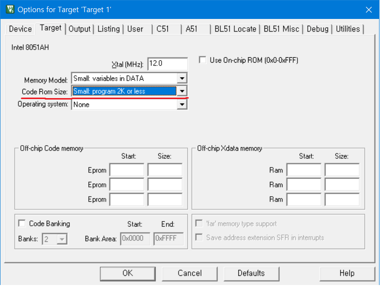 Target 에서 Code Rom Size 를 Small program 2K or less 로 선택해 줍니다.