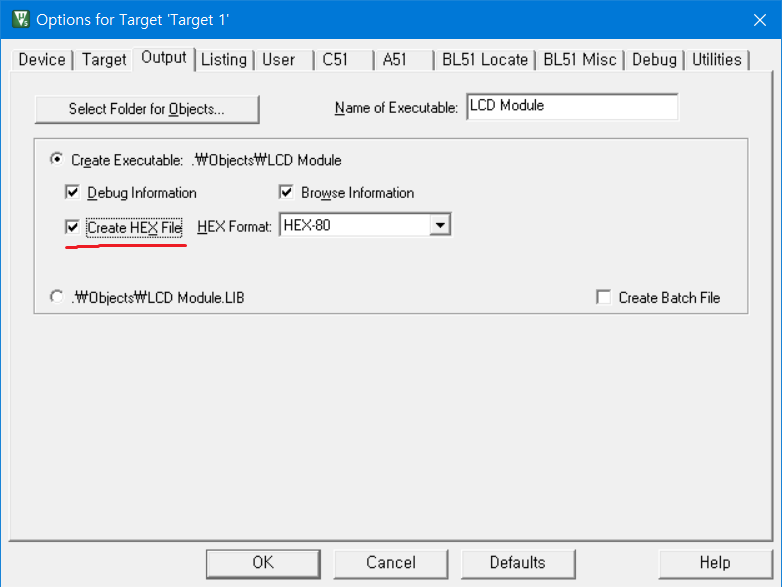 그리고 컴파일된 내용이 edsim51 에서 읽을 수 있도록 옵션을 정해주어야 합니다.