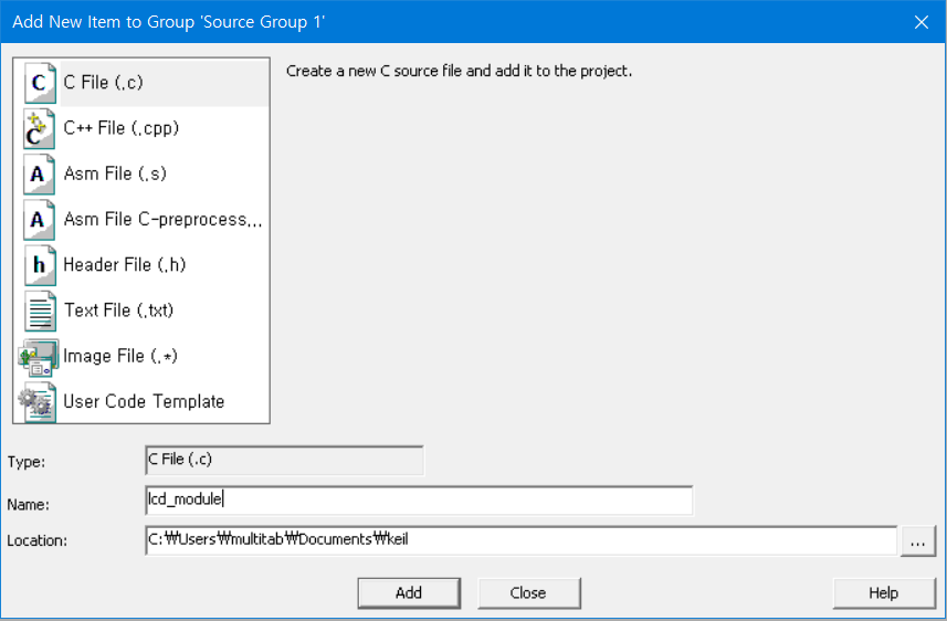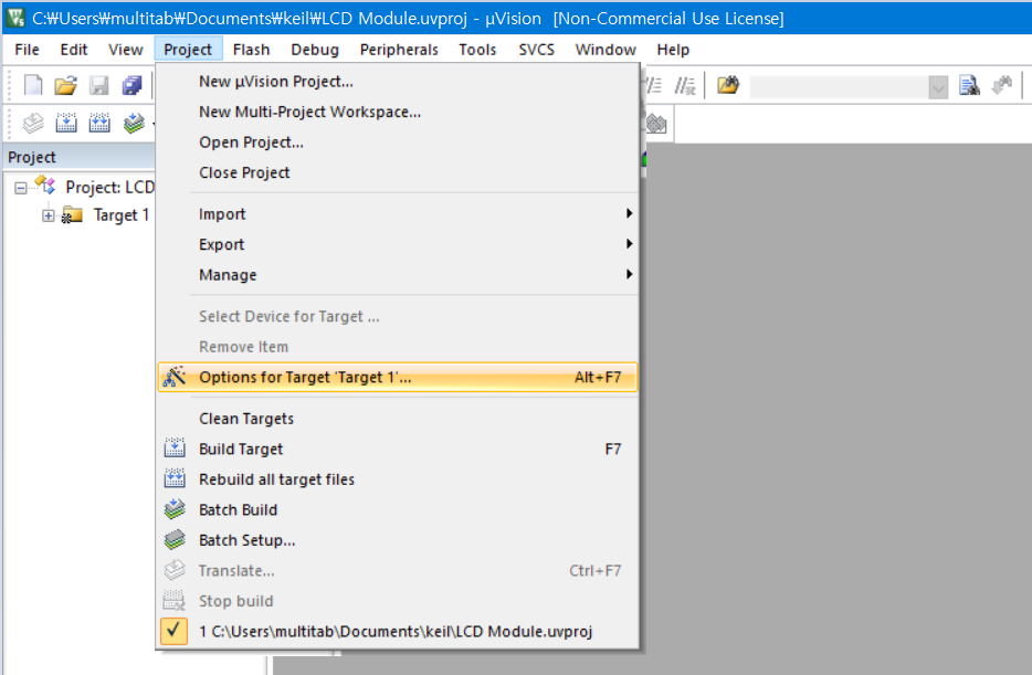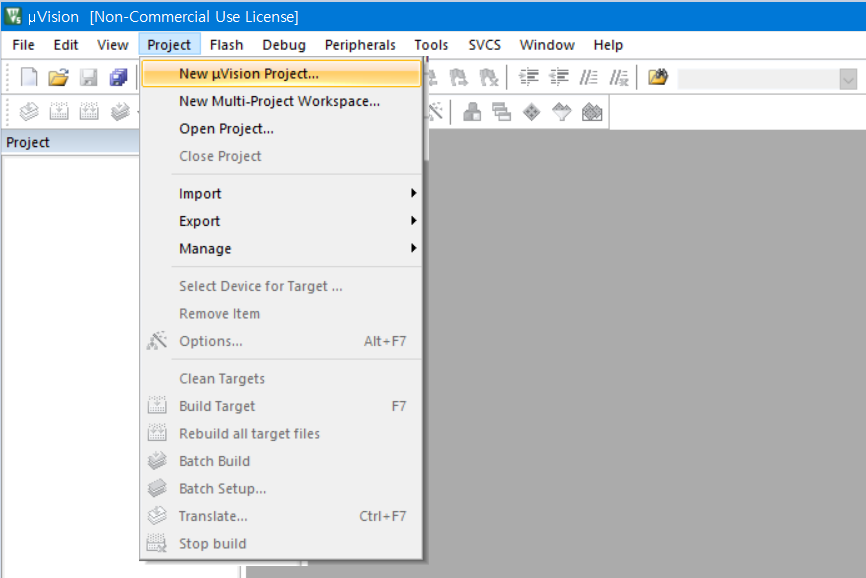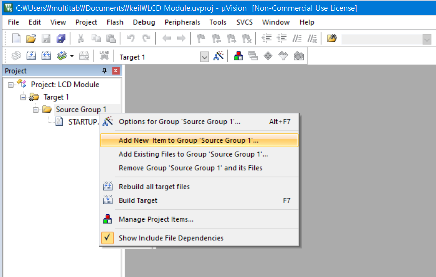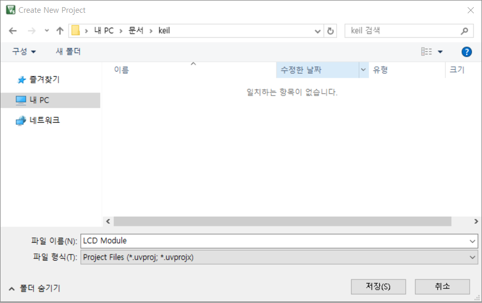 시작 후 Project - New uVision Project 에서 적당한 경로와 프로젝트 이름을 정해줍니다. 저는 LCD Module 이라고 했습니다.