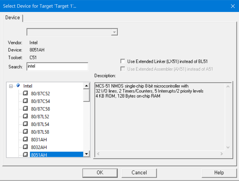 그러면 바로 타겟 장치에 대한 옵션이 나오는데 이때 Search 에 intel 을 쳐 넣으면 나오는 결과중 '8051AH' 를 선택하고 OK 를 눌러 줍니다.