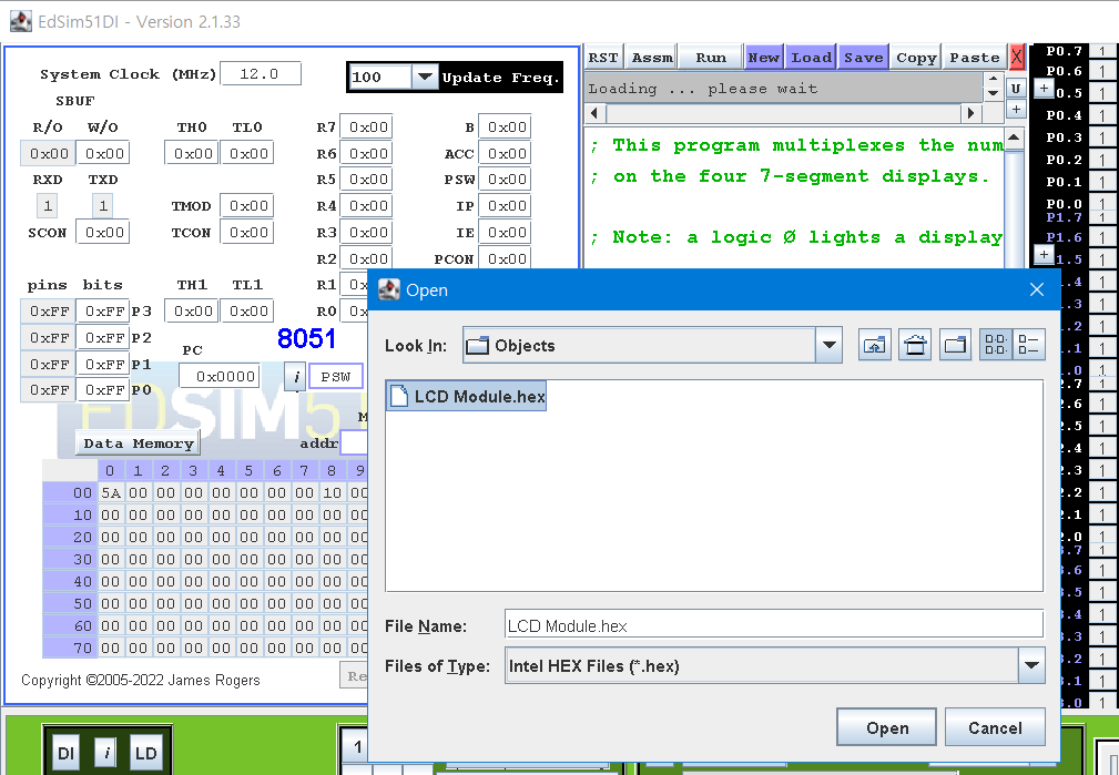 이제 다시 EdSim51 로 돌아가서 Load 메뉴를 통해 해당 소스를 읽어 드립니다.
