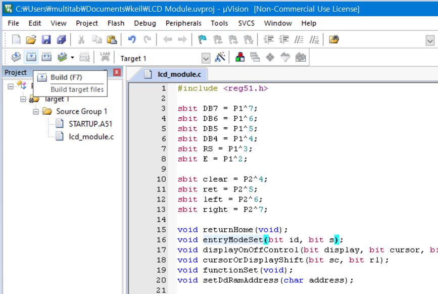 http://www.edsim51.com/examples/lcd.c 에서 소스를 복사해 붙여 넣고 저장을 해줍니다.