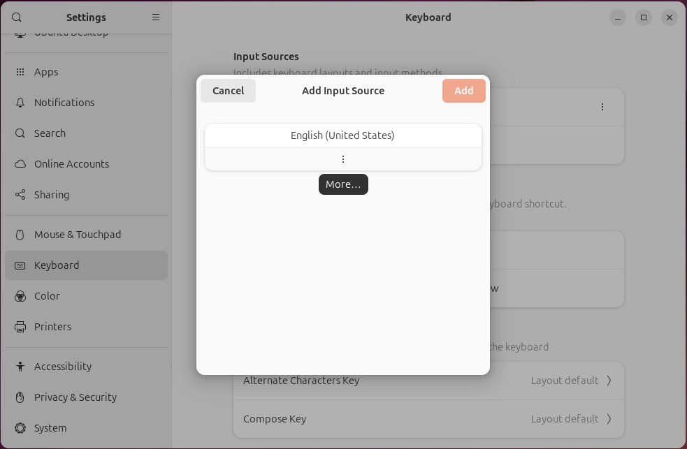 Settings - Keyboard - Input Sources - + Add Input Source... 를 선택해 줍니다.