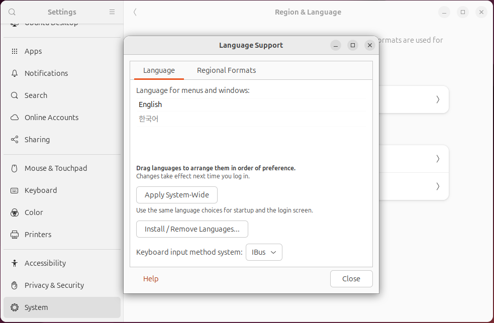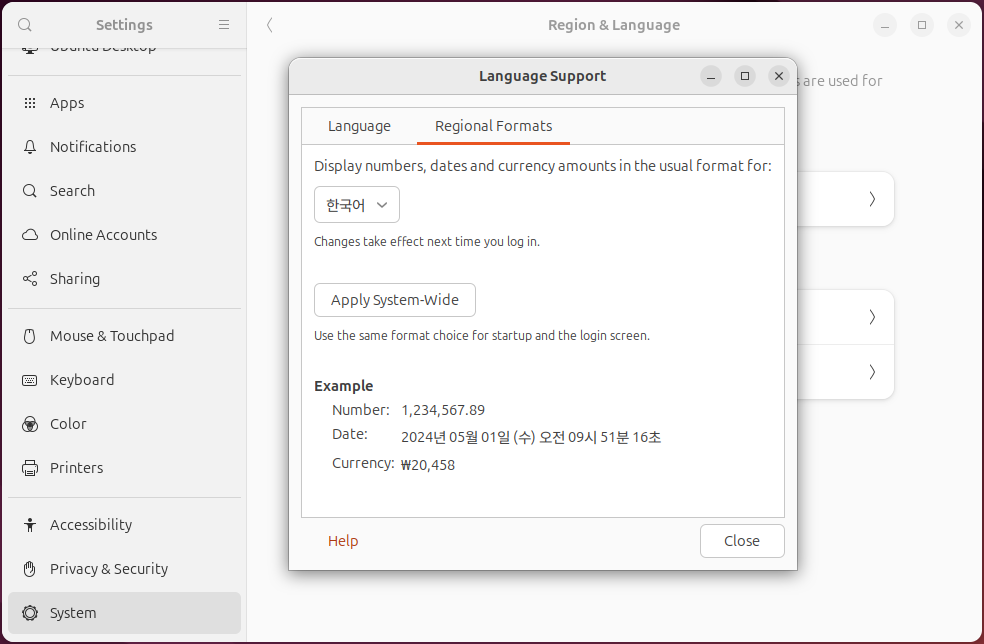 Regional Formats 은 날짜와 숫자 표시에 관한 내용인데 이역시 English 로 유지하셔도 되지만, 저는 '한국어' 로 바꾸어 사용합니다. 처음 바꾸면 Example 부분에 에러 메세지가 나오는데 다음번 reboot 후에는 제대로 보입니다. .