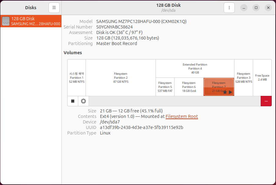 설치가 완료된 이후 파티션 모습니다. 기존 40G 중 20G 를 나눠가지며 Partition 7 이 추가되었습니다. 기존 Partition 5 에서 별표가 사라졌네요.