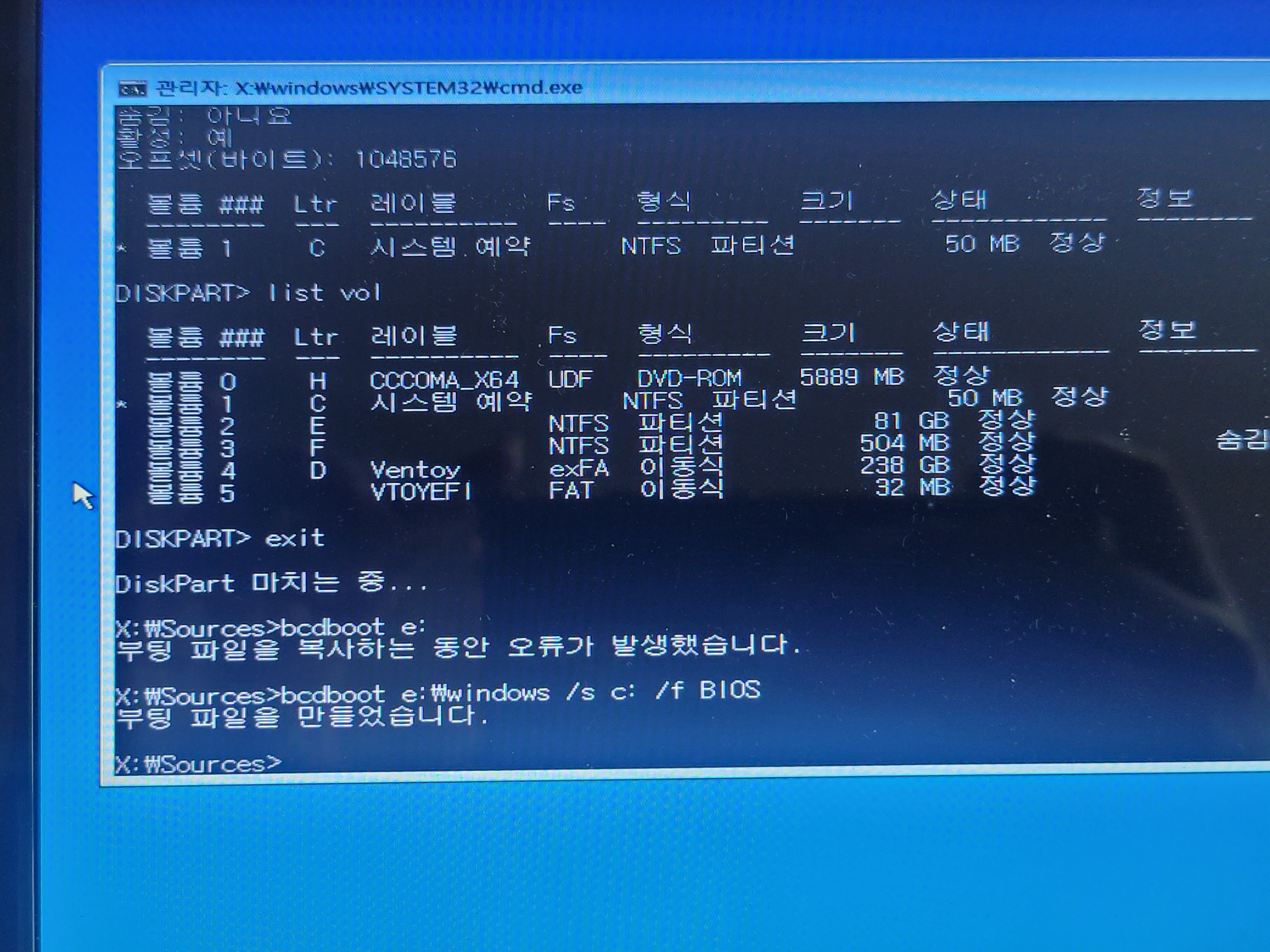다시 아까 Windows 의 설치의 복구 메뉴를 통해 '명령 프롬프트' 에 가서 다음을 실행합니다.