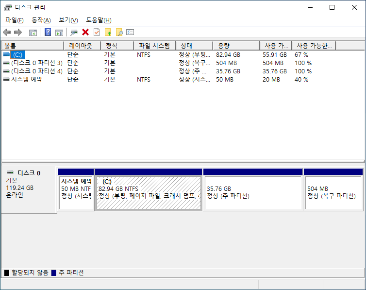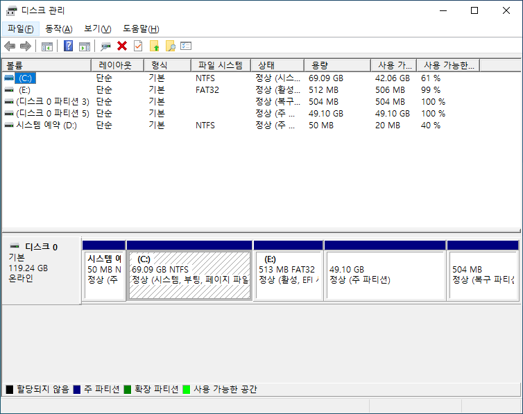 혹시나 하고 Windows 10 쪽에서 디스크/파티션 정보를 확인해 봤지만 역시나 처음과 같고 아무런 변화도 없습니다.