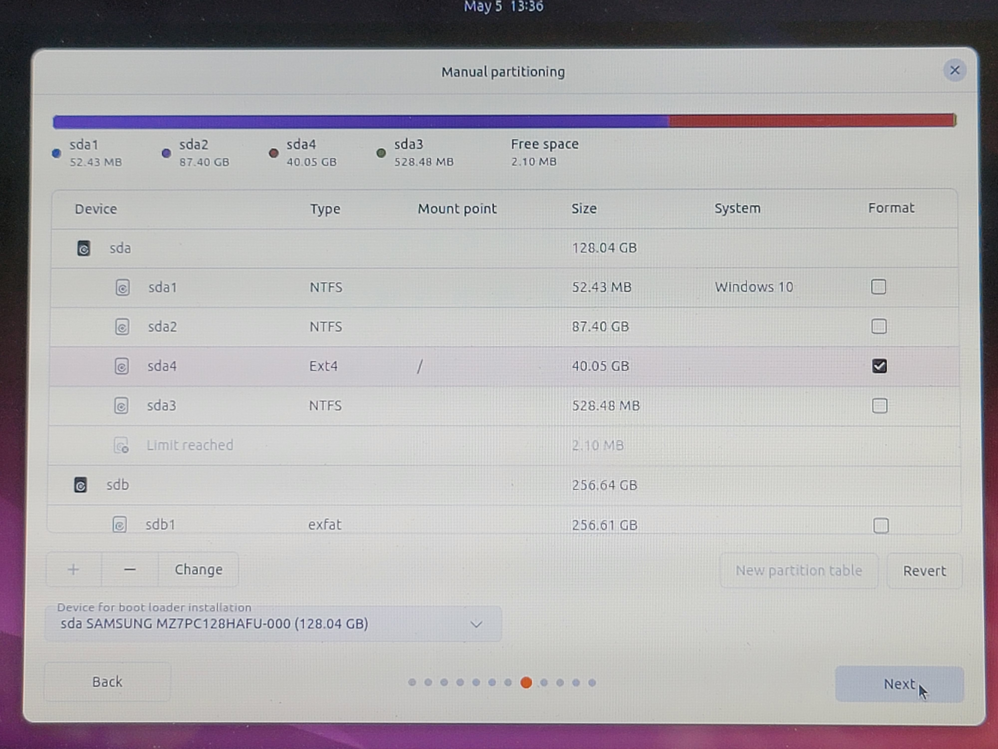 Installation Type 메뉴에서 세 번째인 'Someting else' 매뉴얼 선택 후 기존 4,5,6,7 파티션을 지우고 40GB 짜리 Ext4 의 sda4 로만 추가하고 / 로 마운트 포인트를 지정해 줍니다.