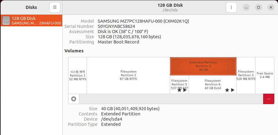 단순히 리눅스 쪽 파티션이 안 보이는 것이라면 그러려니 할 수도 있는데, 디스크 사용 가능용량을 보면 91.92GB 로 보이며 이렇게 되면 리눅스에서 사용하는 40GB 는 포함이 안된 것으로 생각됩니다.