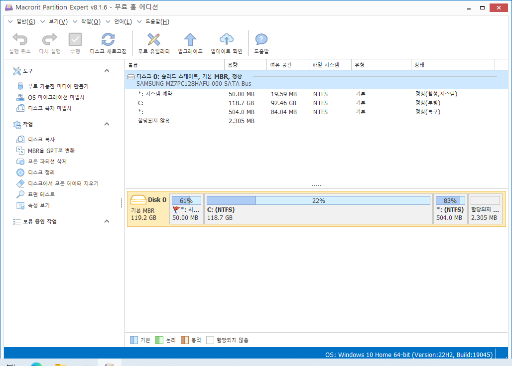 혹시라도 Windows 내장 디스크 관리자가 후져서 안 보이는 건가 하고 외부 유틸리티로 확인을 해봐도 마찬가지입니다.