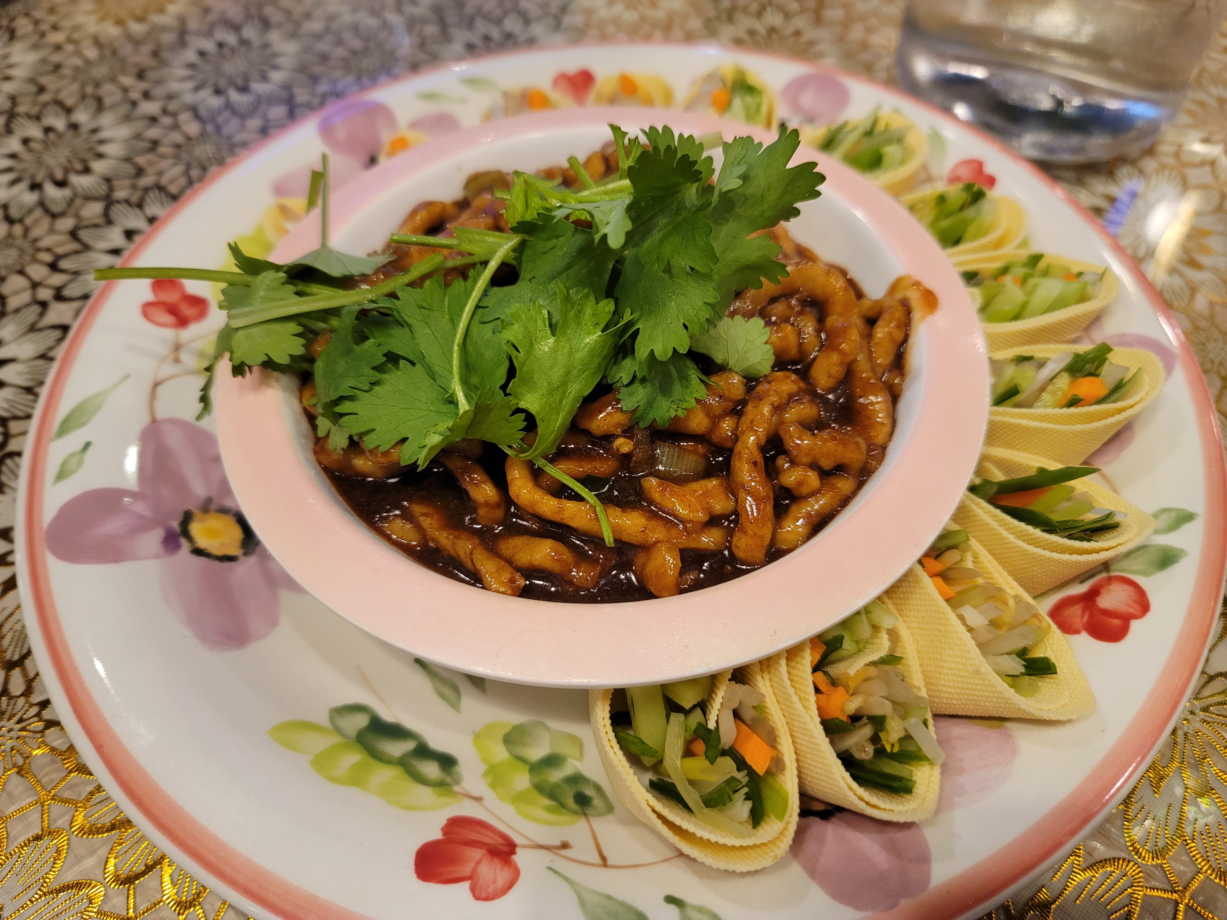 야채를 건두부로 감싸져 있어서 먹기는 편합니다. 돼지고기 양념이 짜장 양념 맛인듯 느껴지네요. 중국에서 먹었던 것과 맛이 좀 다르긴 합니다. 위에 고수도 함께 나오네요.