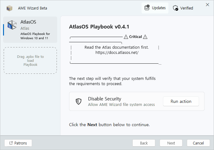 탐색기에서 AtlasPlaybook_v0.4.1.apbx 파일을 끌어서 AME Wizard 의 왼족 사이드바에 넣어 줍니다.