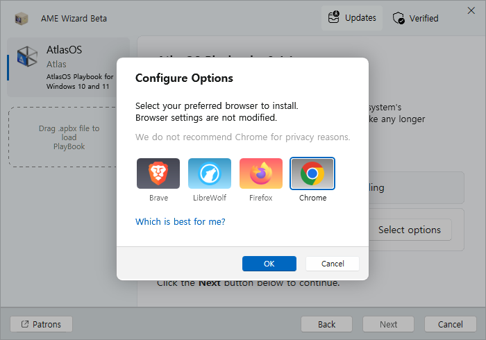 중간에 Microsoft Edge 브라우저까지도 지워버리는데 정 아쉽다면 남겨 놓으셔도 됩니다. 기본값으로는 Brave 라는 녀석이 선택되어 있는데 저는 아무래도 Chrome 을 사용하는 것이 편해서 이것을 선택하였습니다. 이 부분은 취향대로 선택을 하시면 됩니다.