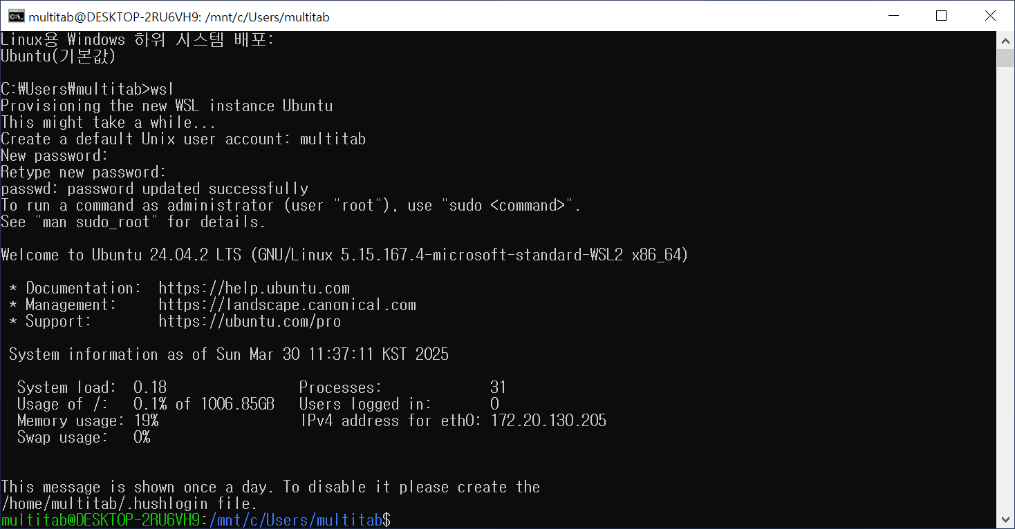 제 경우 설치 드라이브가 D: 이기 때문에 /mnt/d 로 지정하고 -s 뒤의 용량을 22GB 로 해주었습니다. 처음에 25GB 로 하니 너무 커서 안된다고 22GB 로 조정하라는 안내 메세지가 나왔습니다.