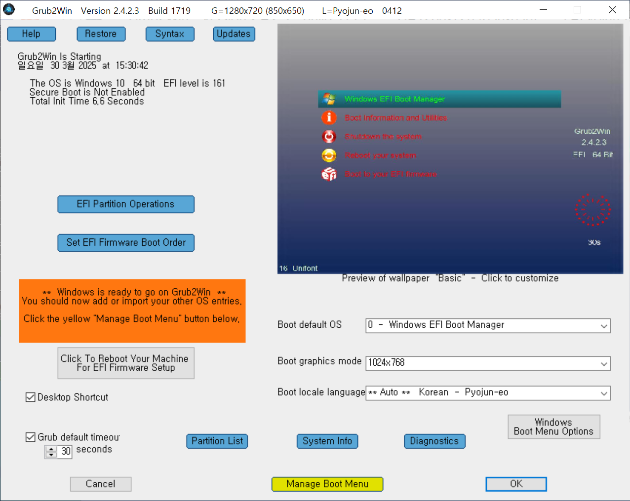 하단에 Manage Boot Menu 을 클릭해 줍니다.