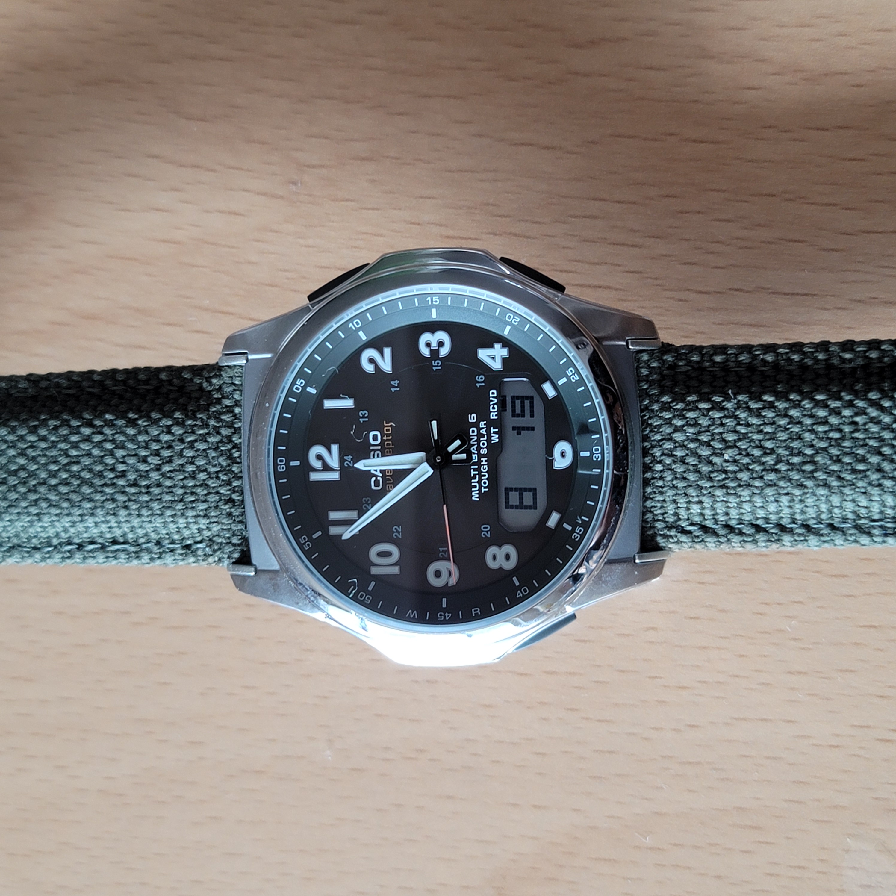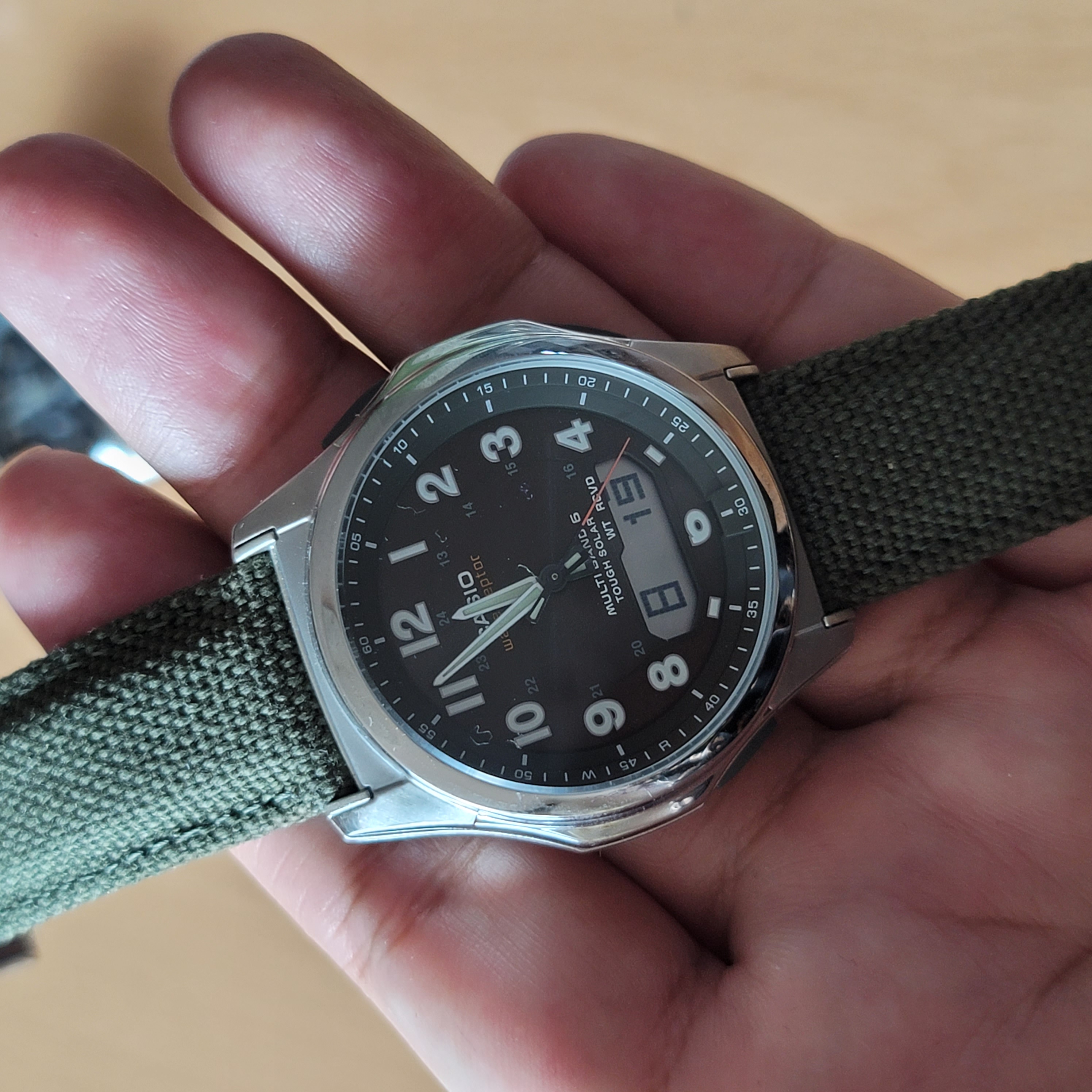 '웨이브 셉터' 라고 부르는 기종으로 전파 수신을 통해 자동 시간 동기화와 '터프 솔라' 라 부르는 태양광 충전 시스템을 지원합니다. 더불어 별도의 액정 화면이 있어서 날짜나 요일 등 여러가지 정보를 표시할 수 있습니다. 지금은 요일이 한자로 보이는데 영문을 포함해서 다른 언어로 바꿀 수도 있습니다.