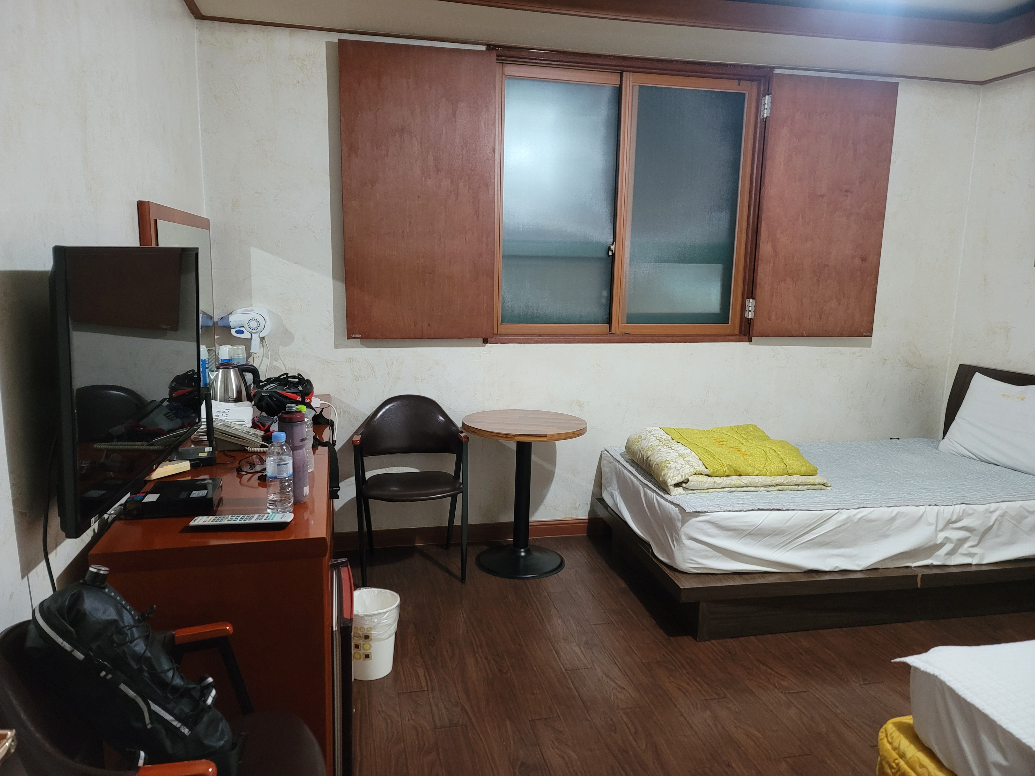 숙소 이름이 이번에도 에O스 모텔이네요. 1층 내부에 자전거를 세워 놓을 수 있는 공간이 있고, 빨래도 맡기면 해준다고 합니다. 숙소가 새것처럼 깨끗한 건물은 아니었지만 사장님은 매우 친절하셨습니다.