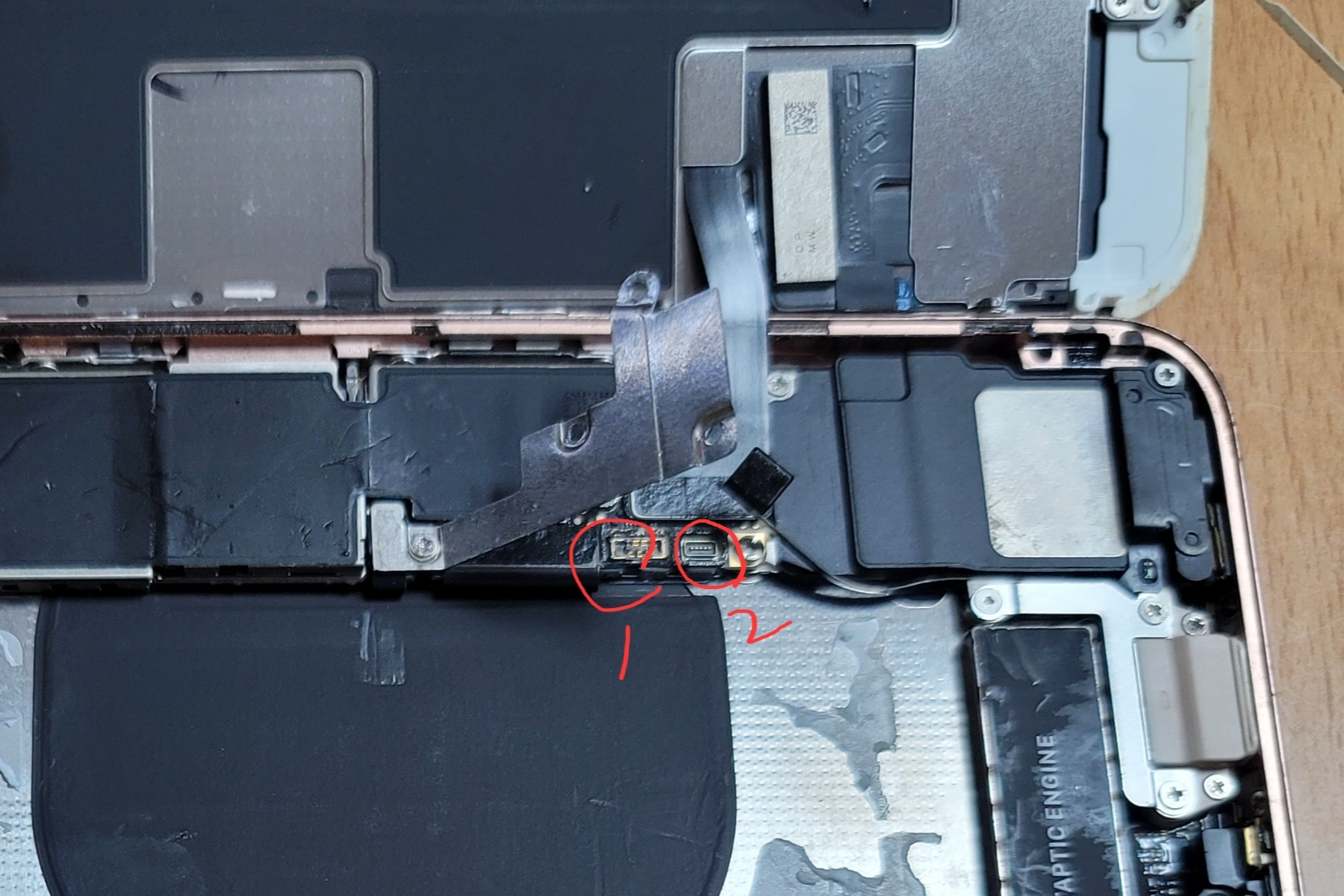 이후 배터리를 떼어내야 하는데 그냥은 잘 안되고 헤어드라이기의 열풍을 좀 쐬어서 뜨겁게 해준 배터리를 떼어 줍니다. 1번으로 표시된 곳이 배터리 연결 단자입니다.