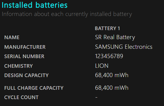 교체 후 정보. 헛. 이런. 68,400mWh 라고 나옵니다. 왠지 뻥스팩에 당한 것일까요? 쿠팡 이러면 곤란한데...(쿠팡 차액 부분 환불 받았습니다. -_-;)