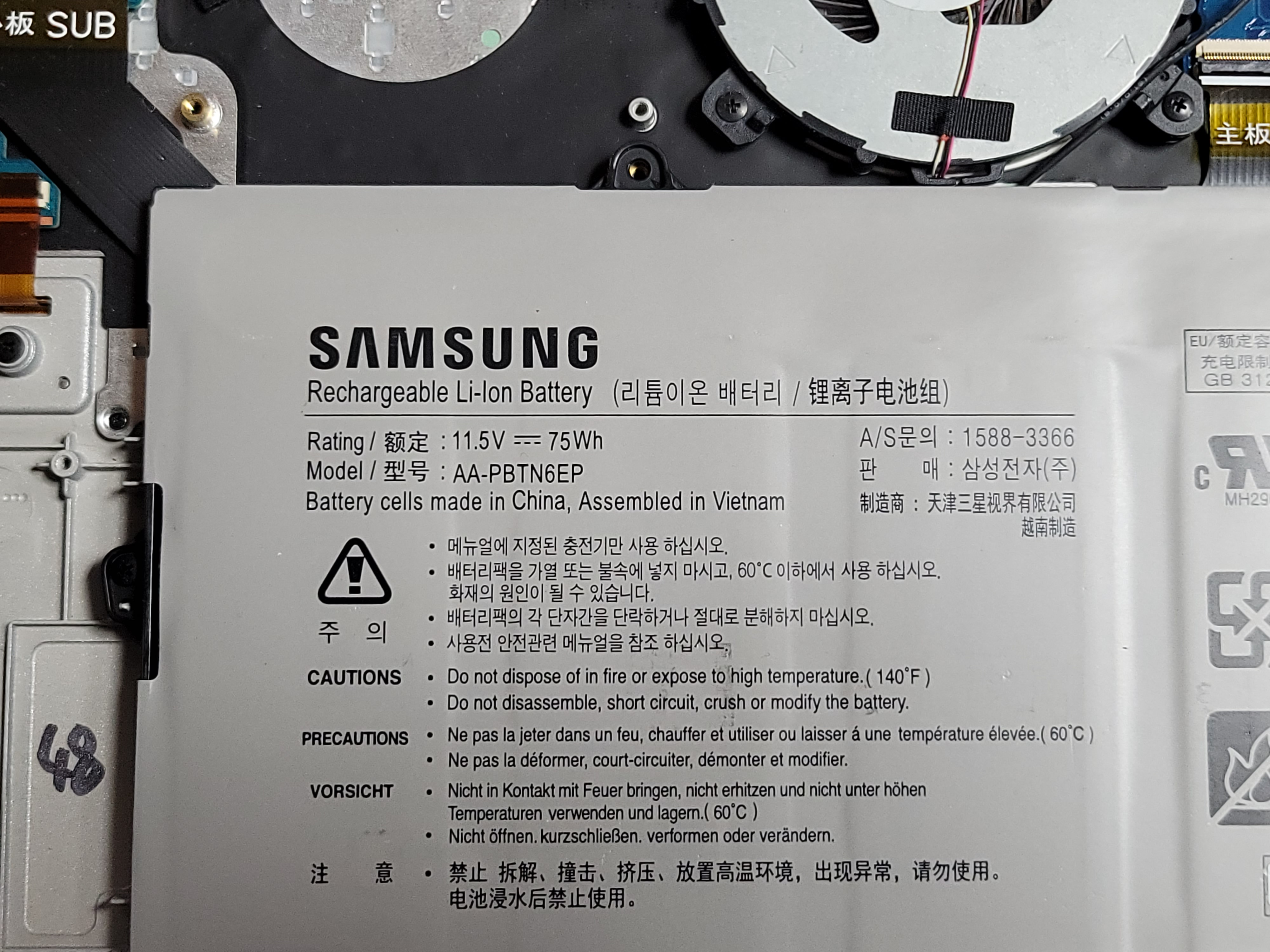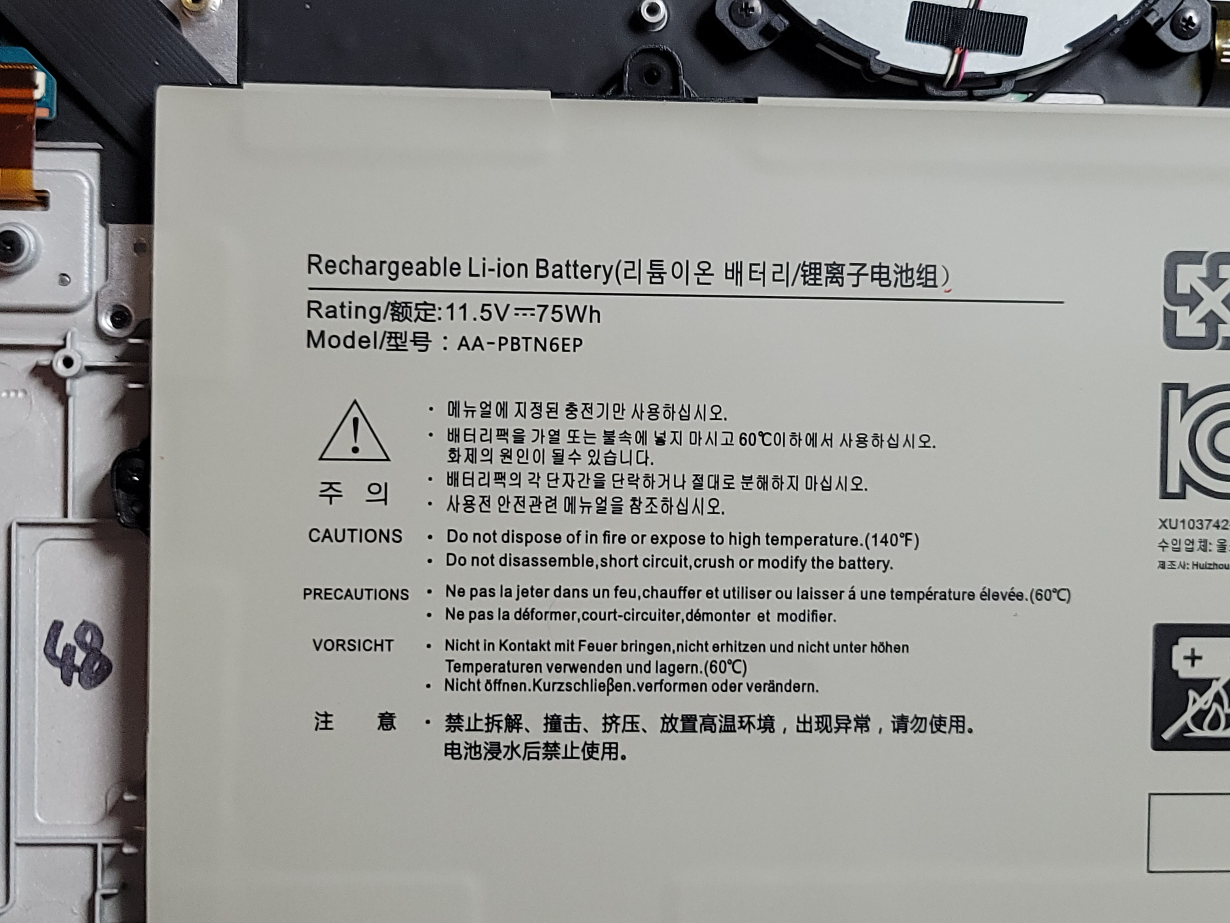 배터리 정보만 좀 확대해 봅니다. 모델명은 AA-PBTN6EP 라고 써져 있으며 용량은 75Wh 입니다.